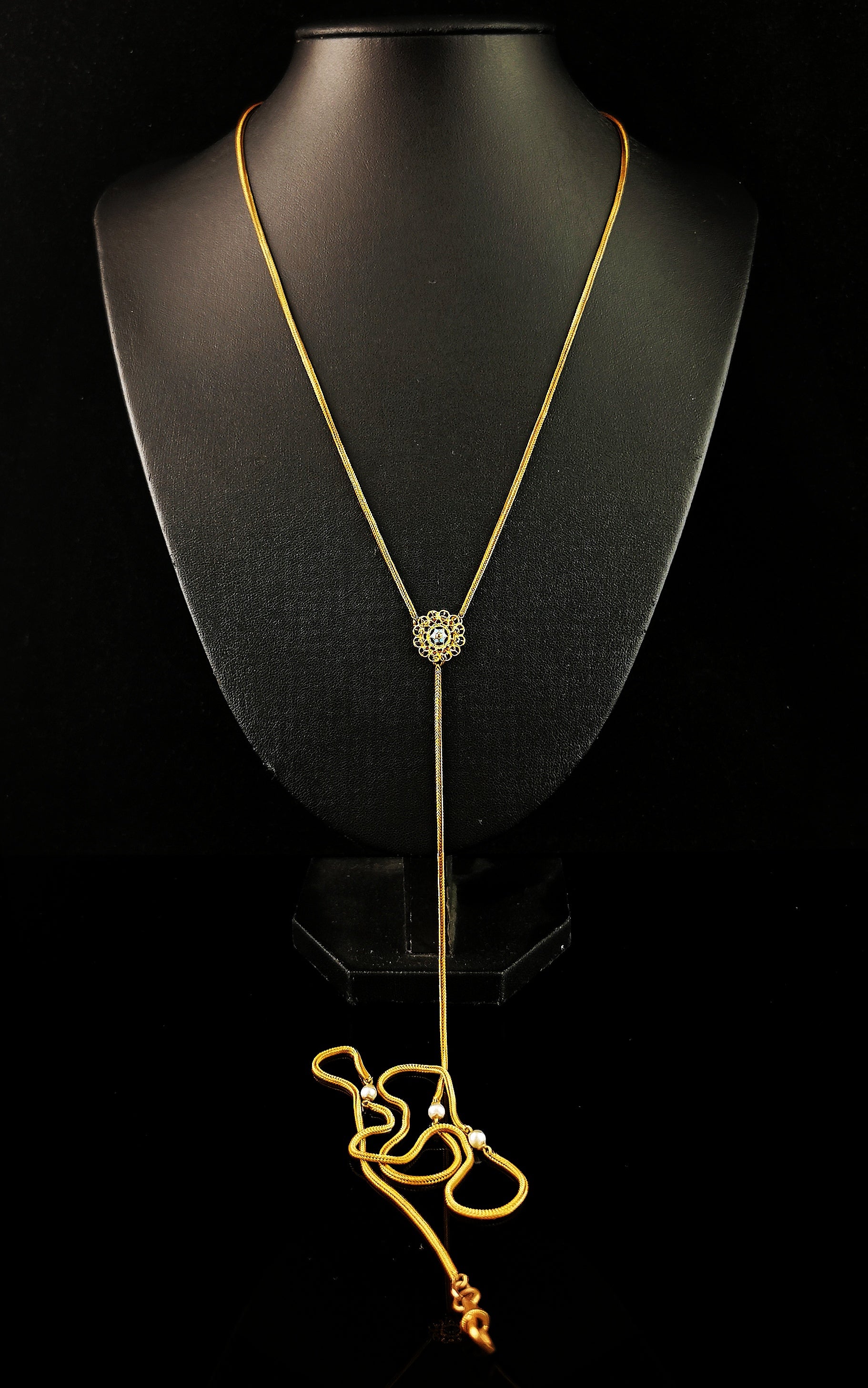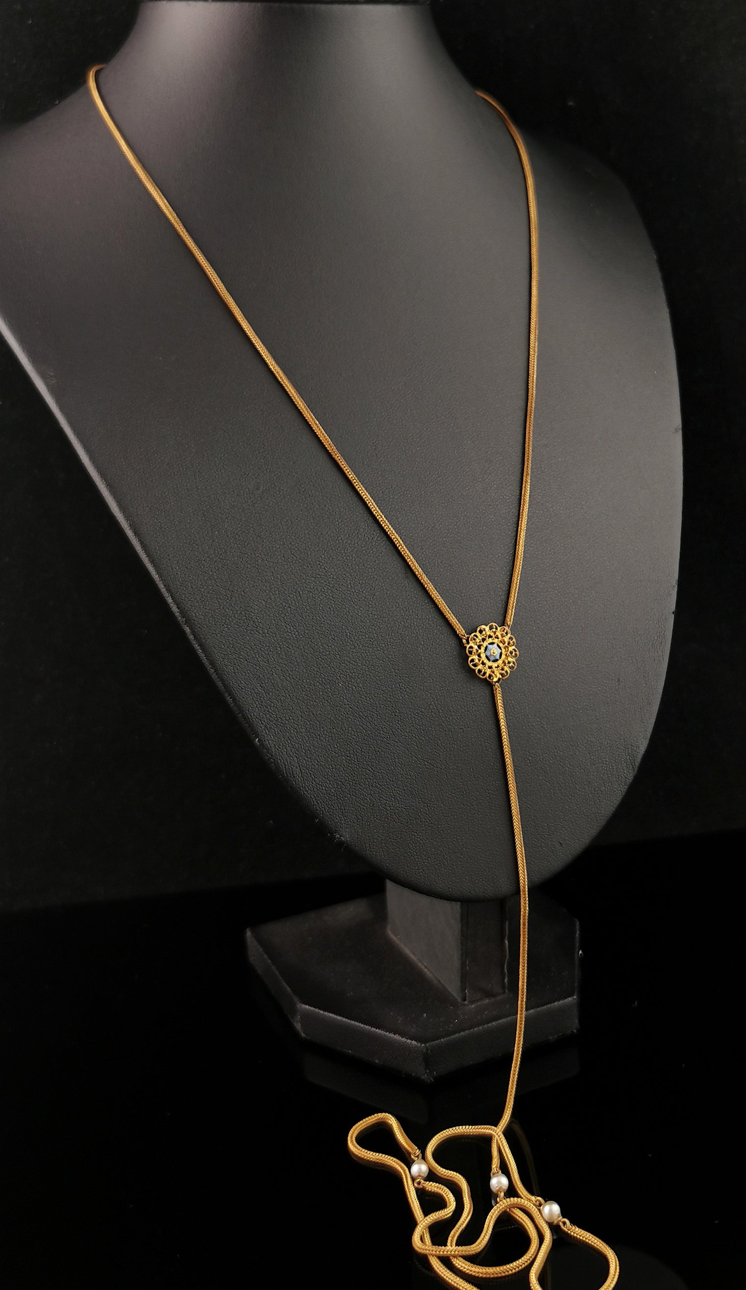 Antique gold plated lariat chain necklace, Edwardian, Faux pearl and Blue enamel flower