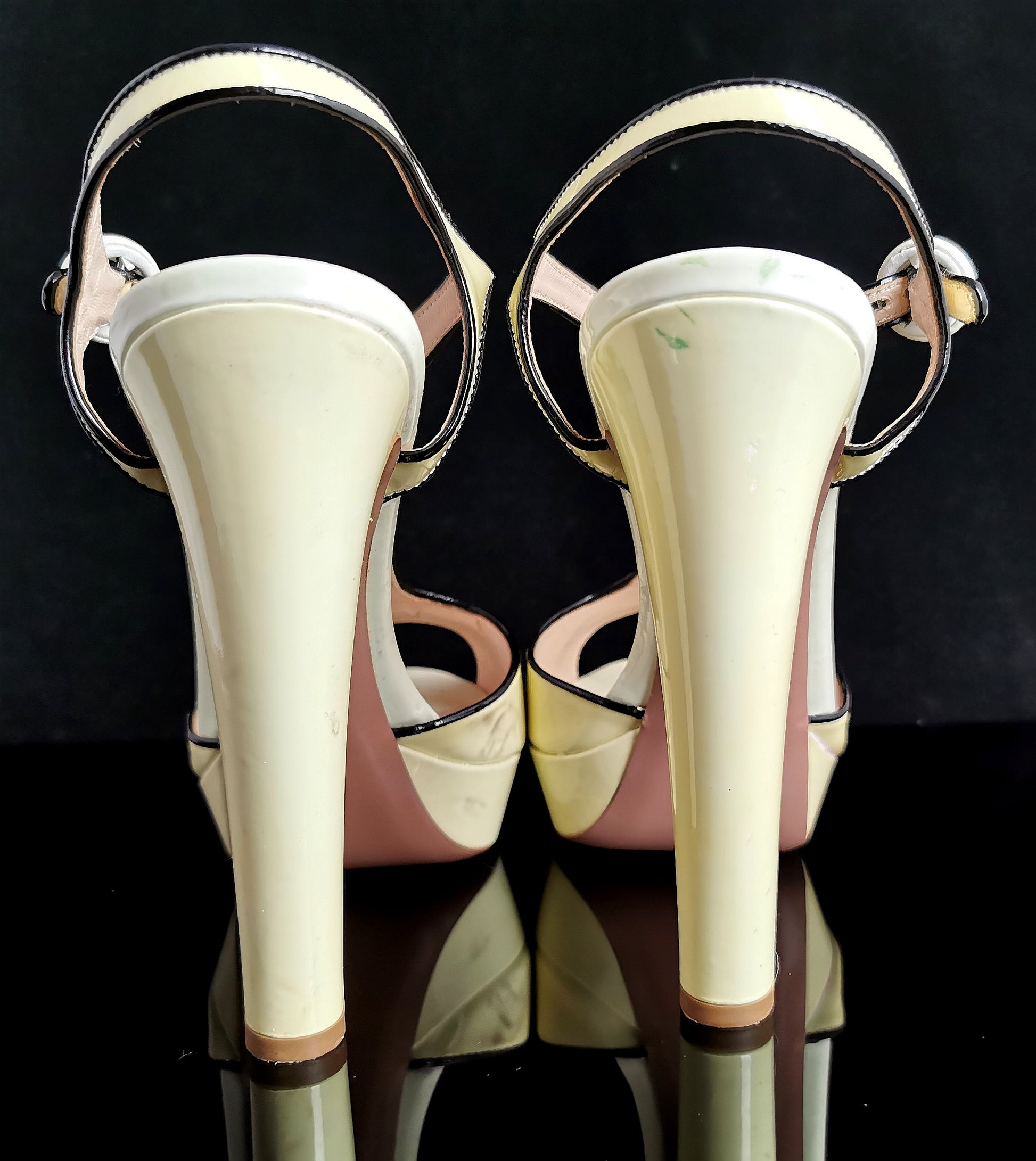 A truly gorgeous pair of Prada patent leather platform heel sandals.