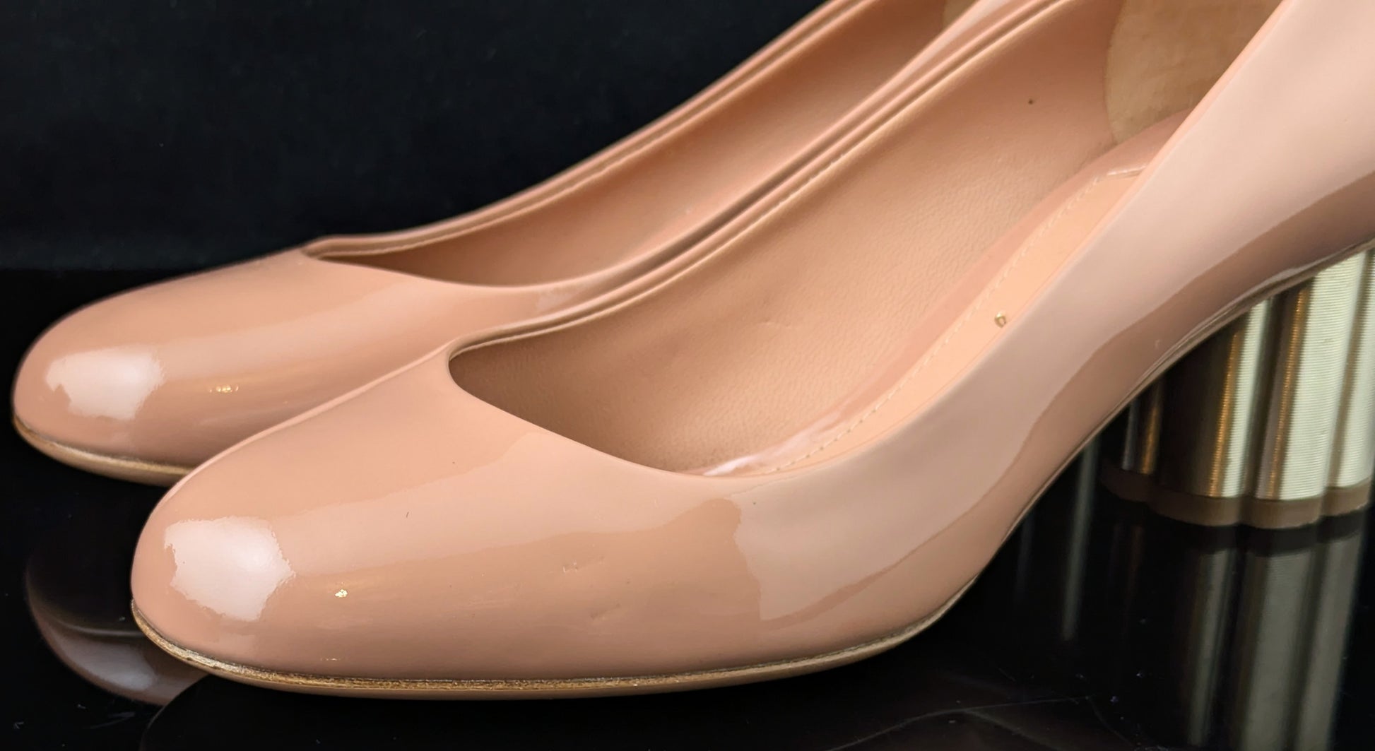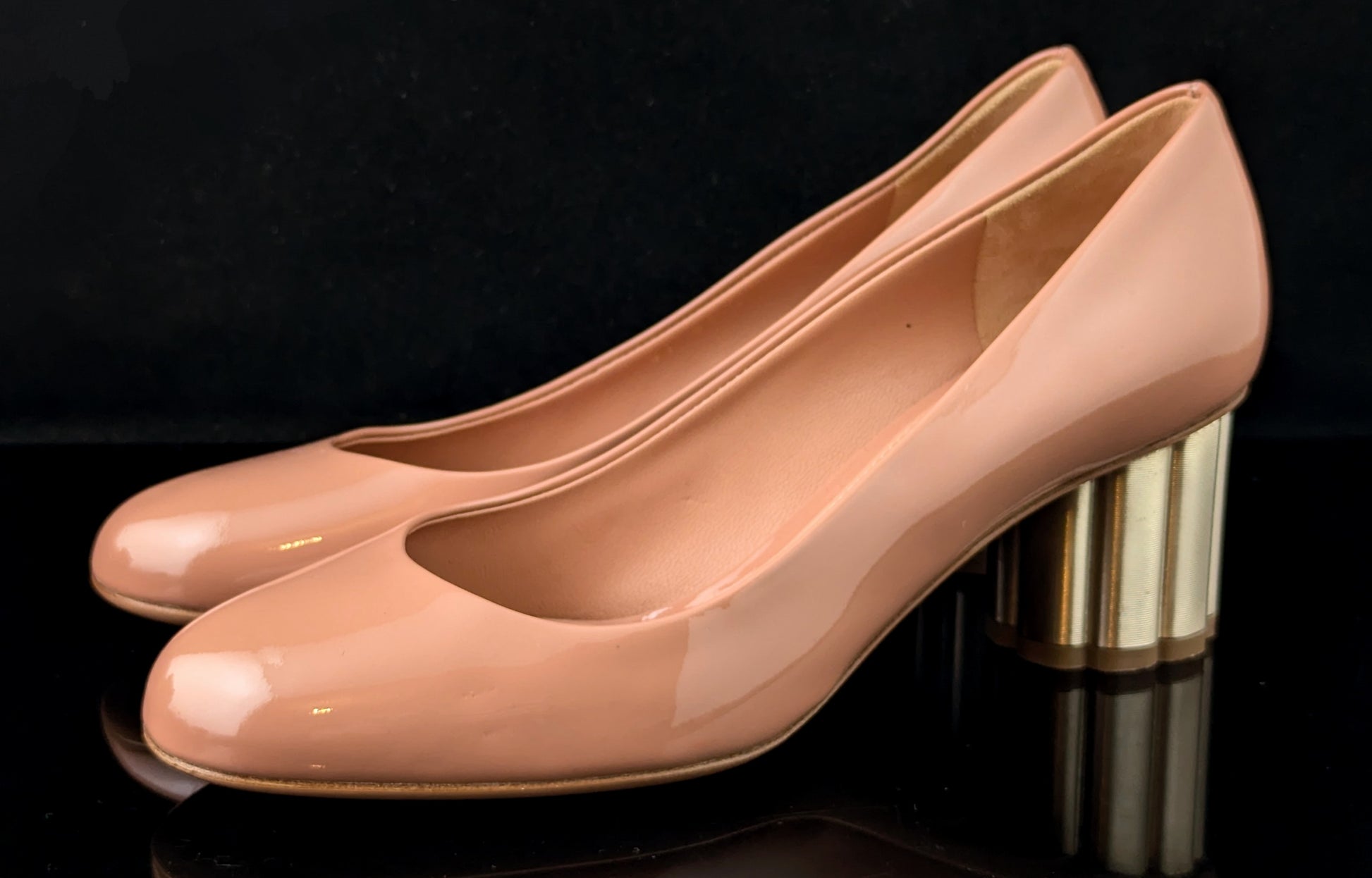 Patent leather in a warm blush pink colour, they are a court style shoe with a lovely chunky scalloped mid heel in metallic gold.