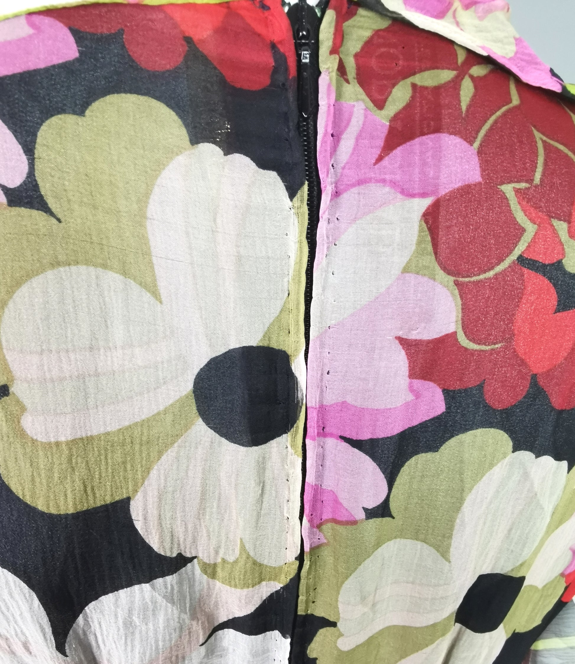 The dress is made from a lovely soft, sheer silk Georgette printed with a floral design on a dark ground, it has an unusual cowl style neckline and gorgeous bishop sleeves with deep button up cuffs.