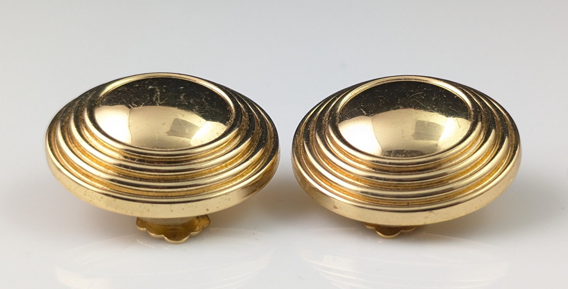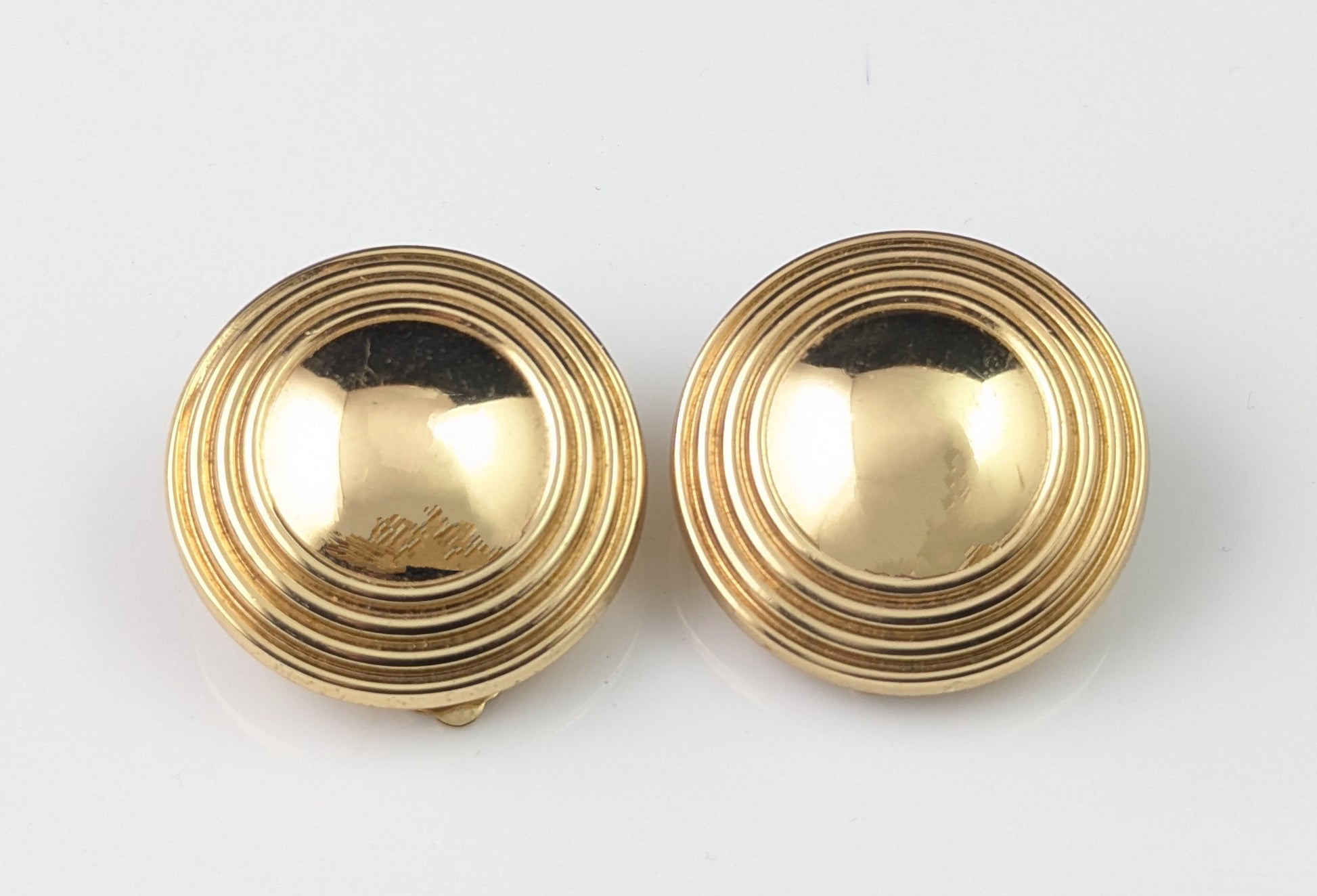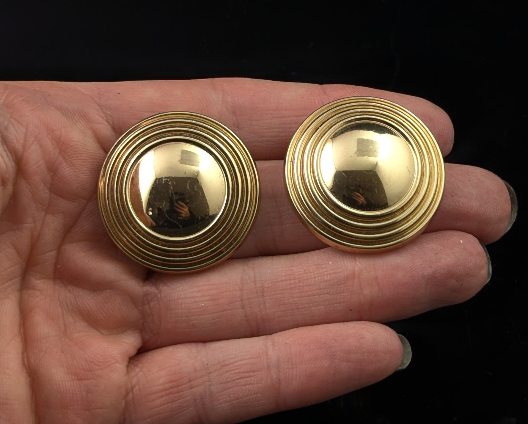 A larger pair of clip on earrings they are a circular shape with a central dome and a border of stripes or rings.