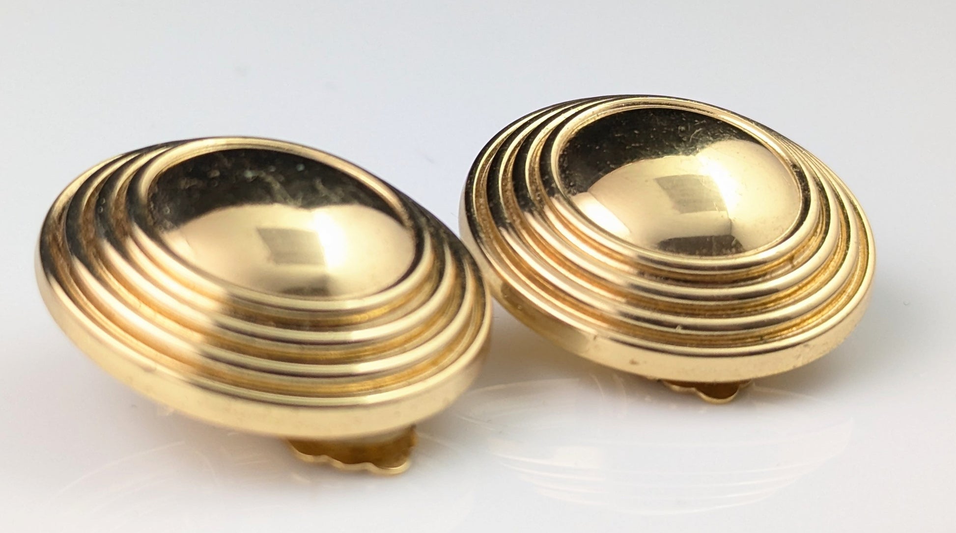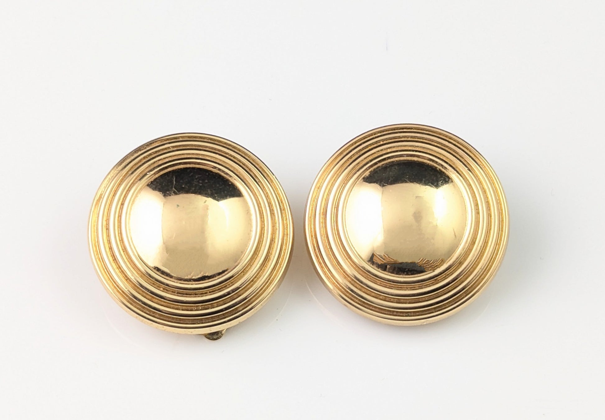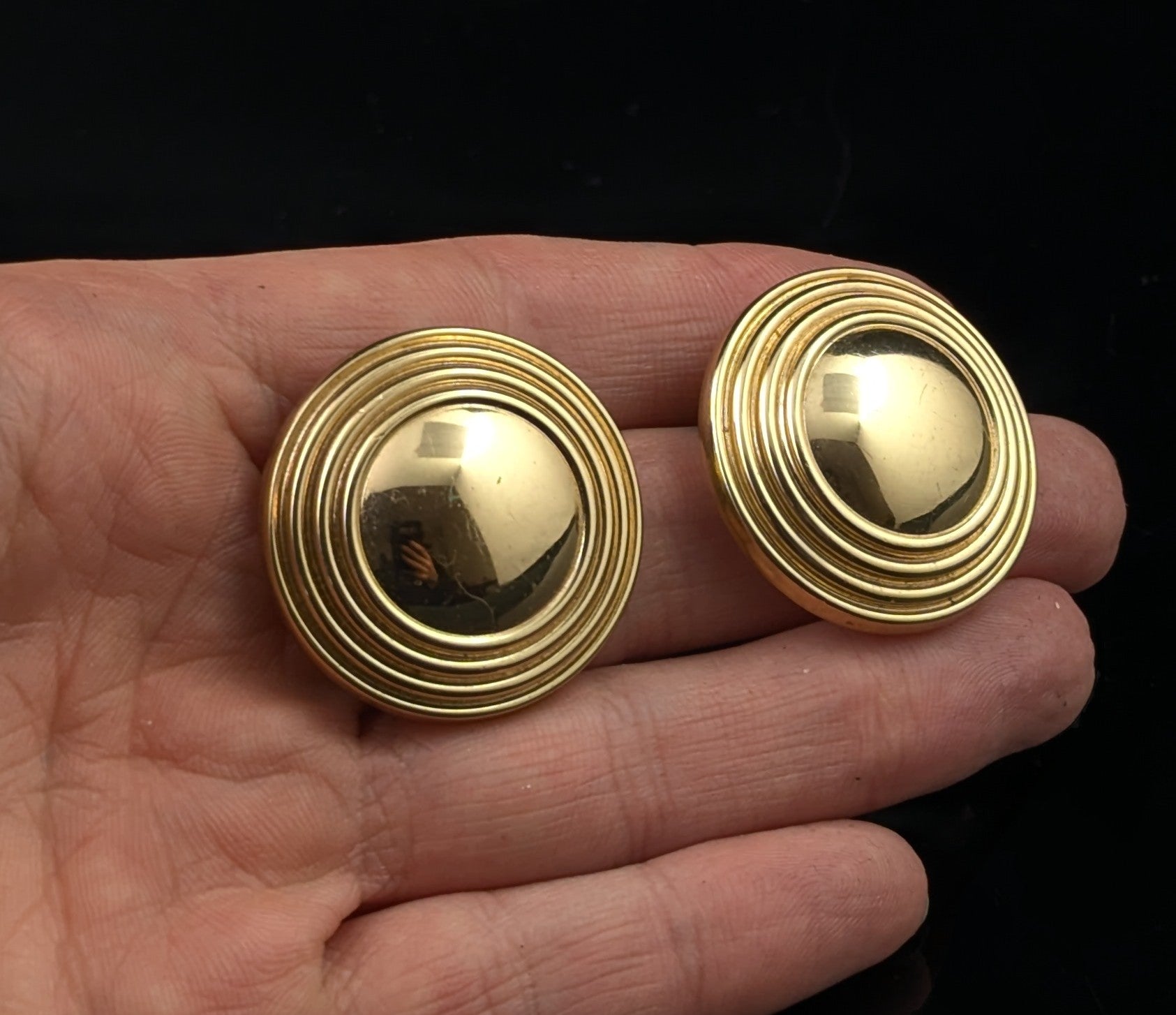 A larger pair of clip on earrings they are a circular shape with a central dome and a border of stripes or rings.