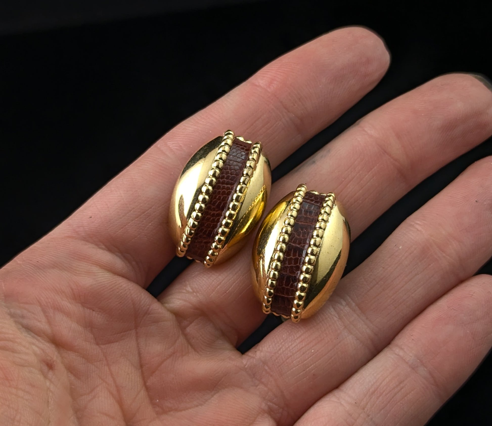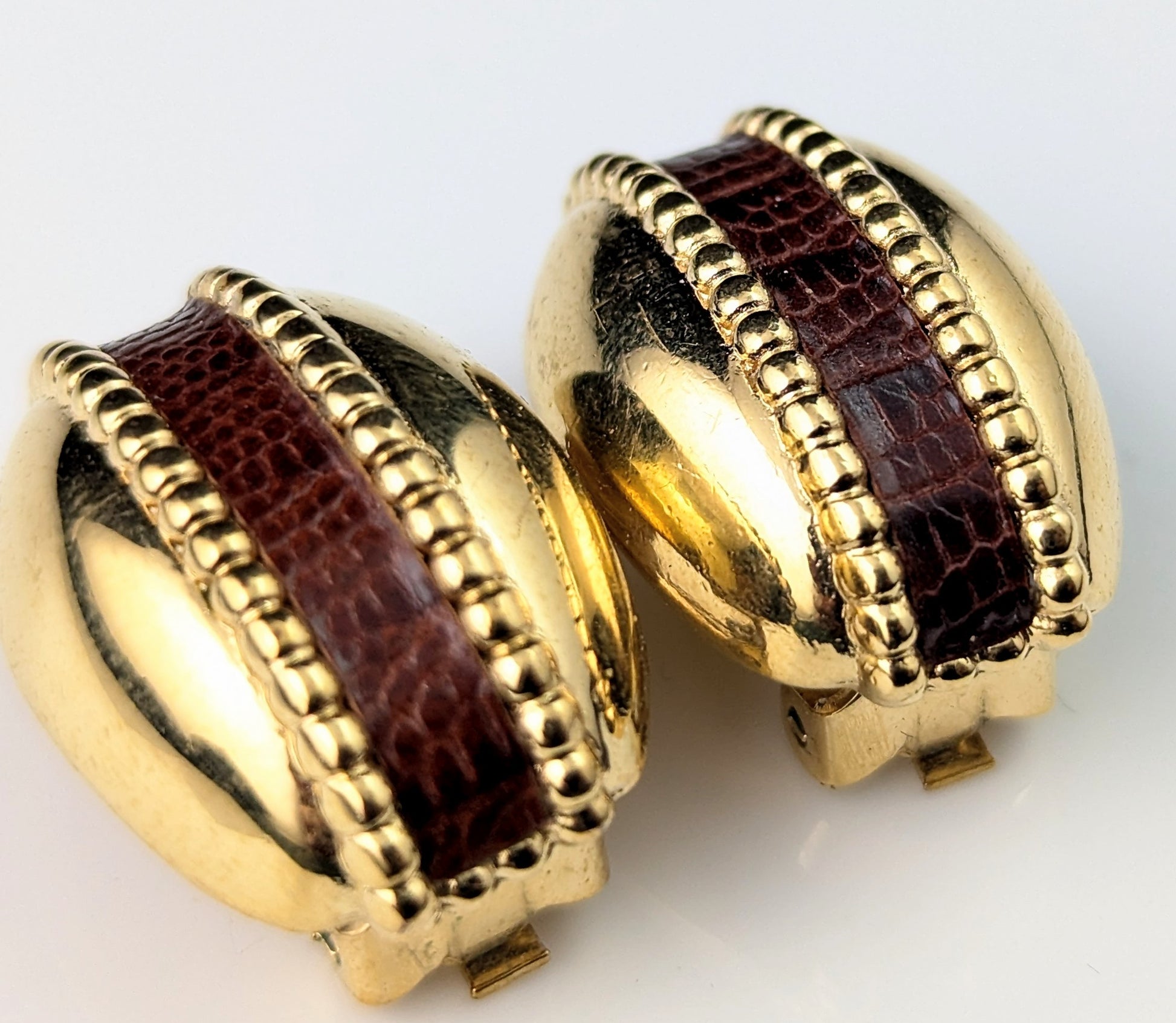 A medium sized pair of earrings in a glossy polished yellow gold tone, they each have a faux Moroccan leather accent running down the centre within a beaded border.