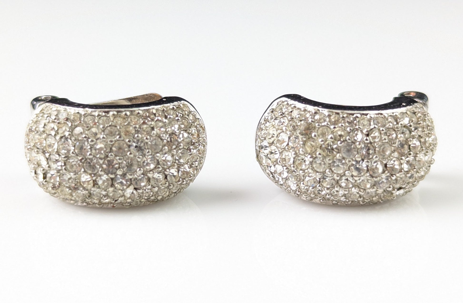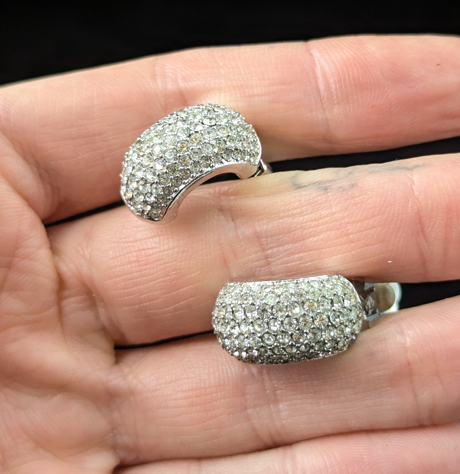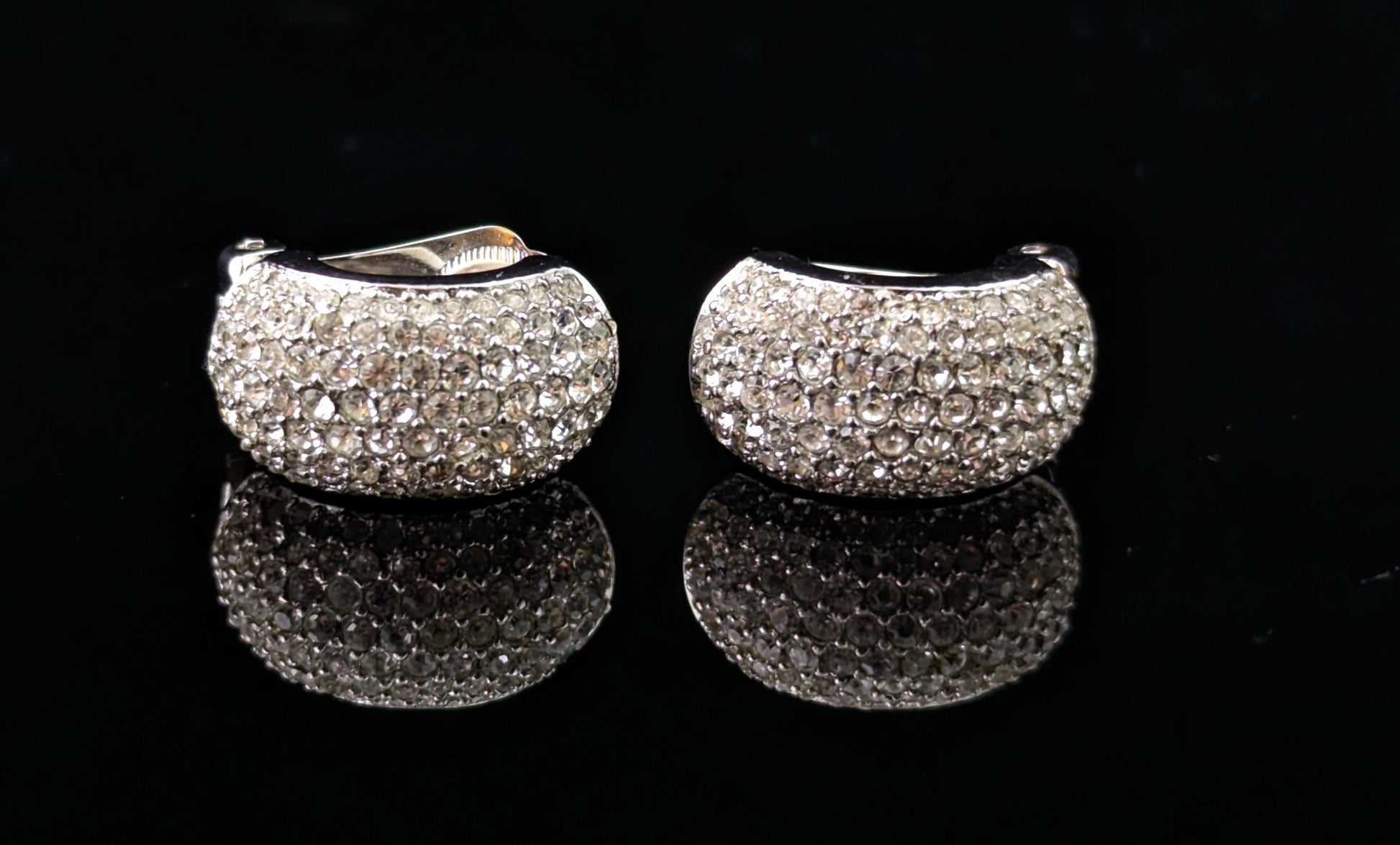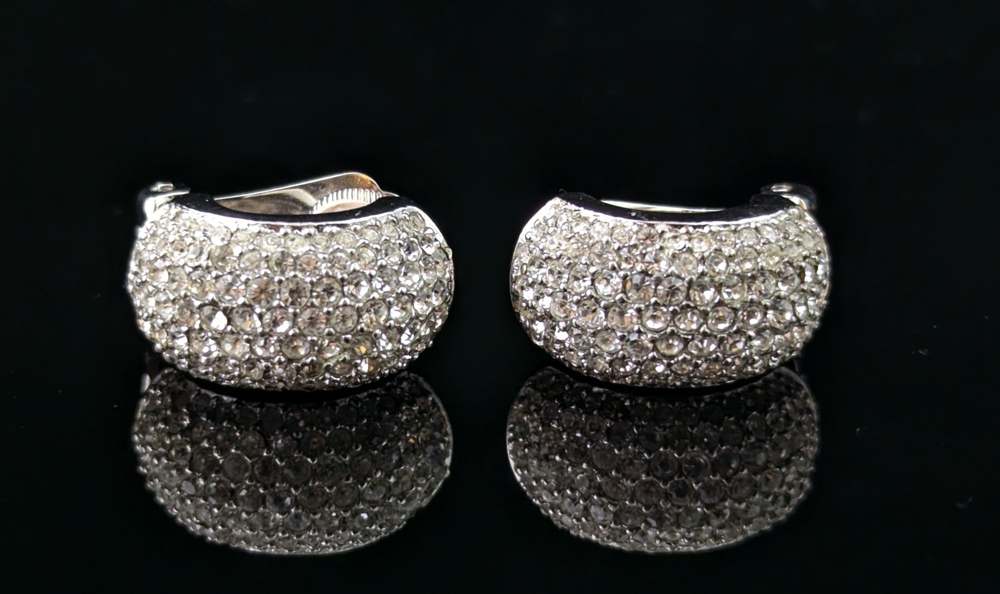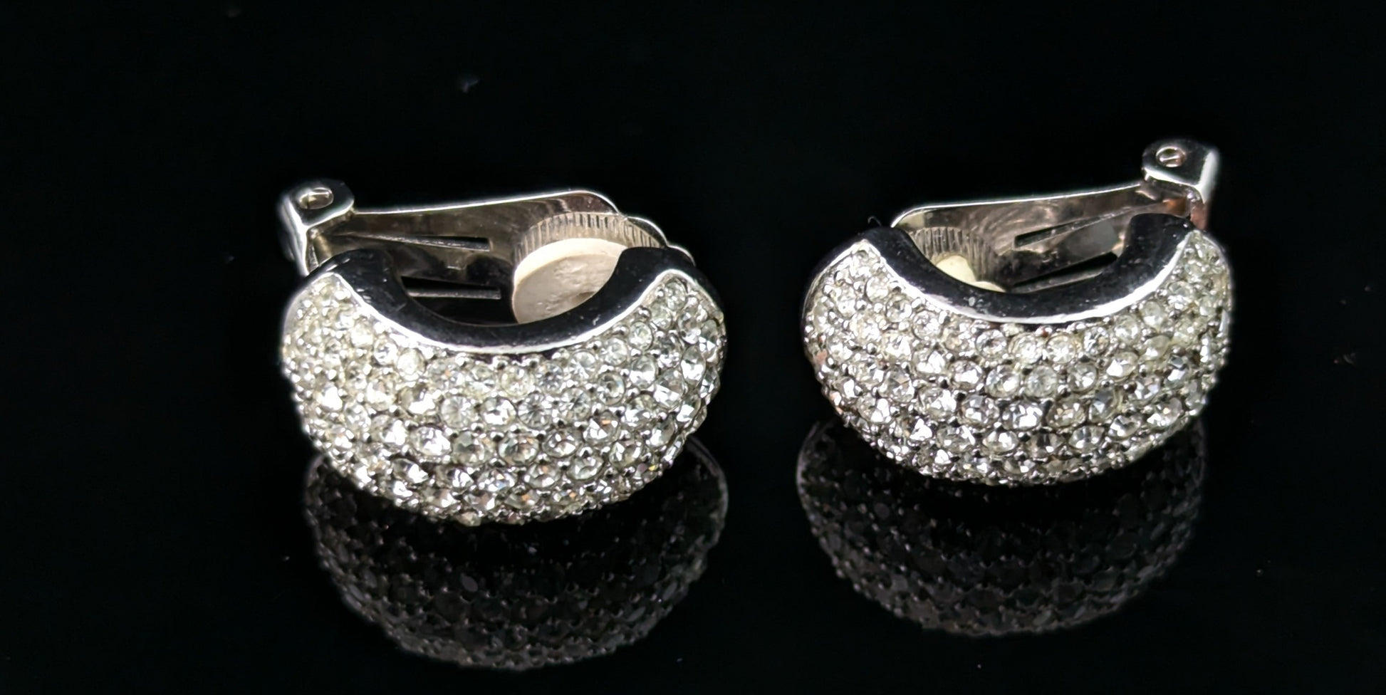 Vintage Christian Dior clip on earrings, Diamanté half hoops, silver tone