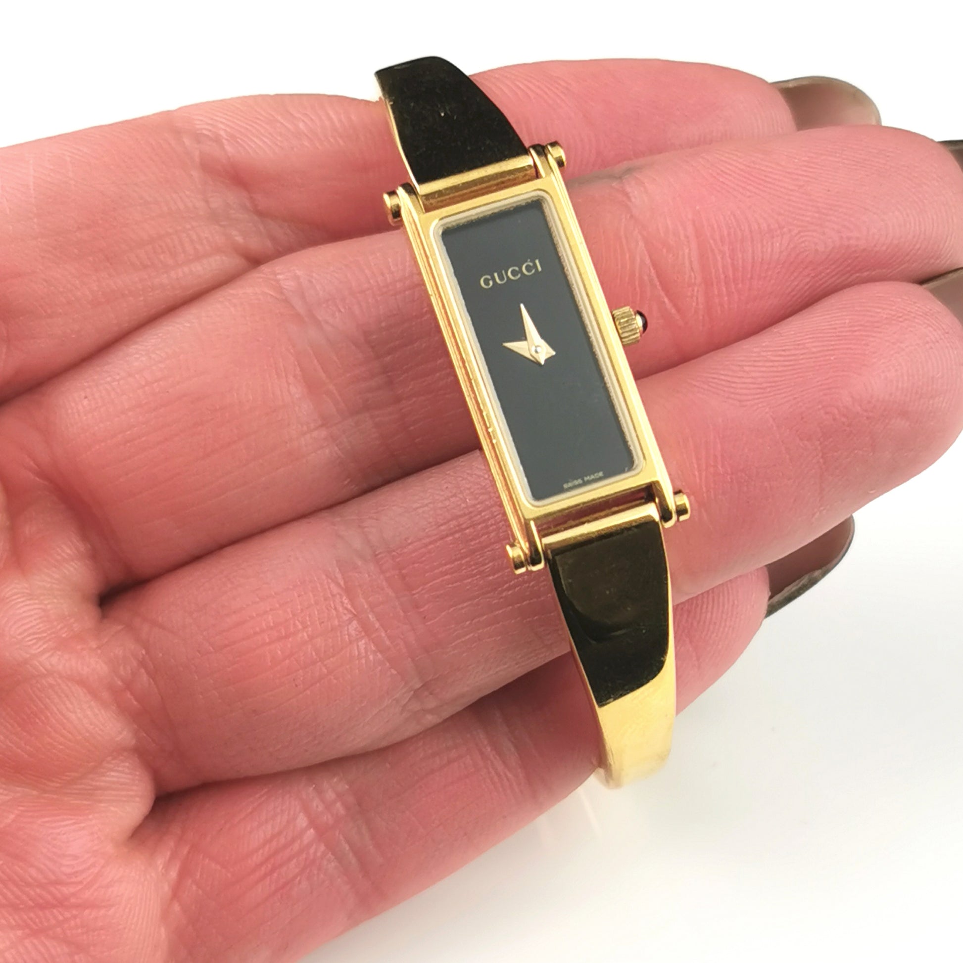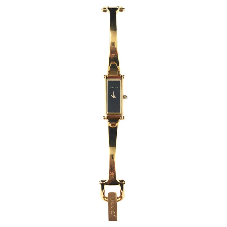 This is a bracelet or bangle strap watch with a nice sleek gold plated bangle strap with the signature Gucci horsebit clasp.