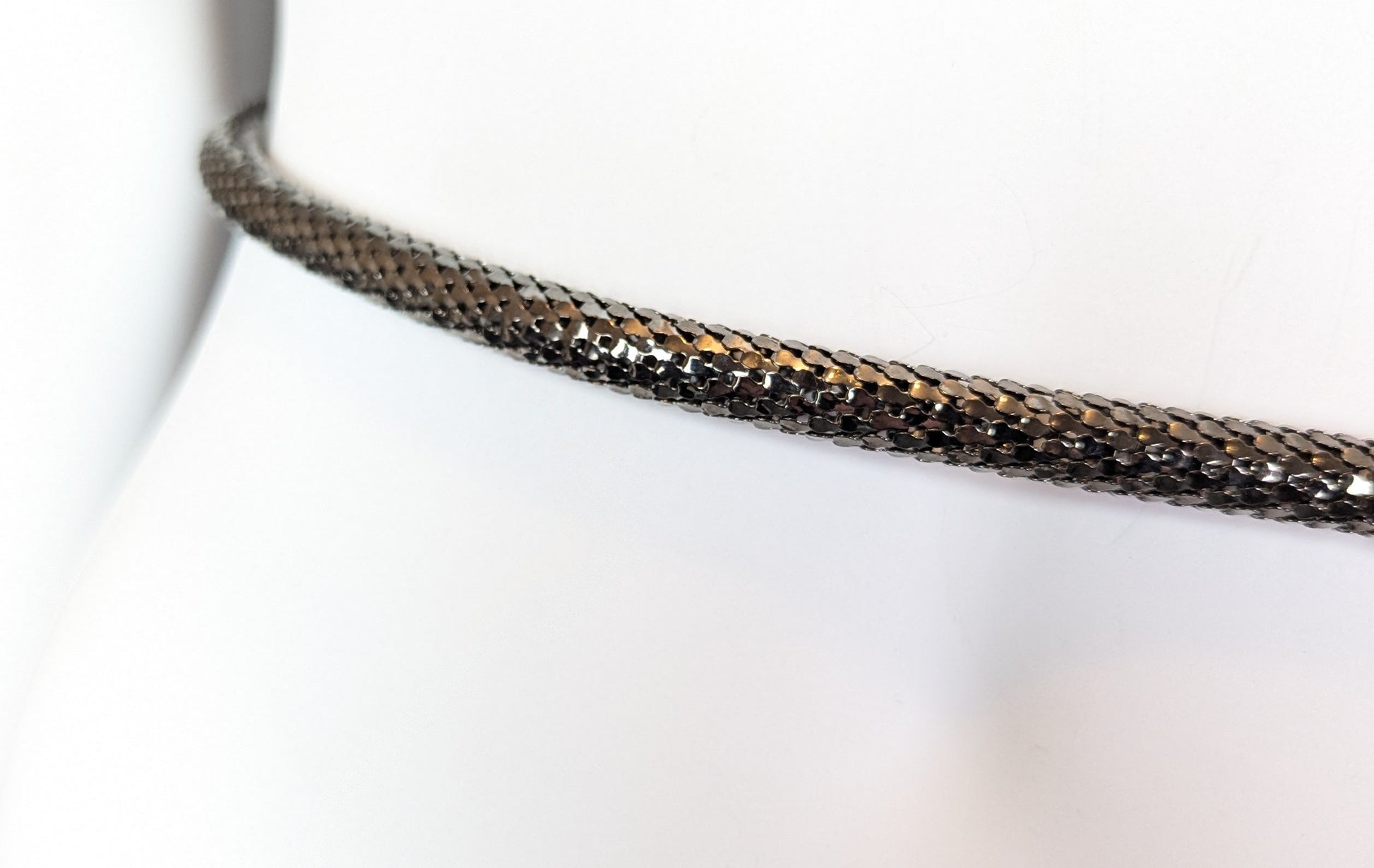 Made from gunmetal grey metal with a flexible core the body has been designed to imitate a snakes scales and the belt fastens with a push c clip.