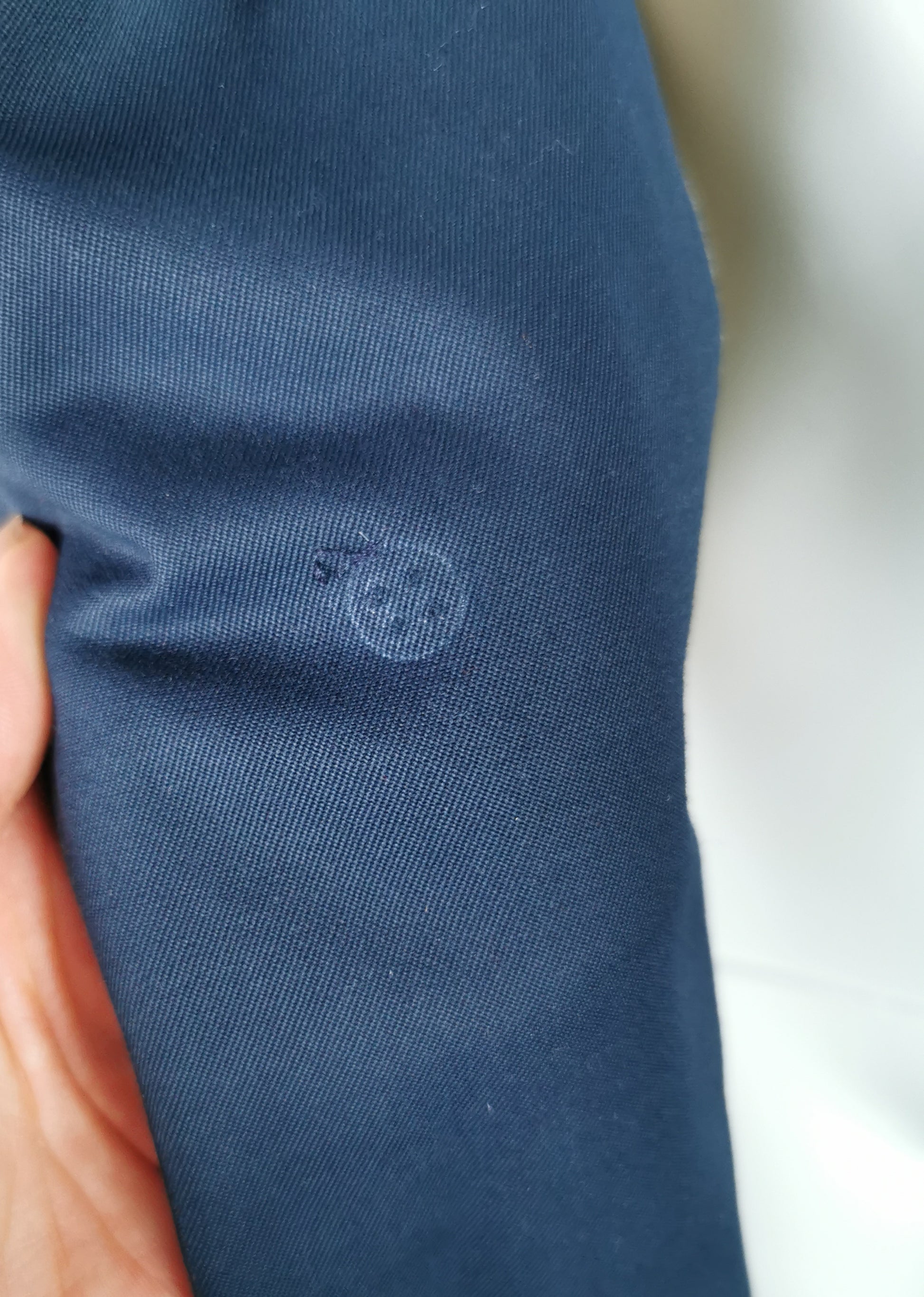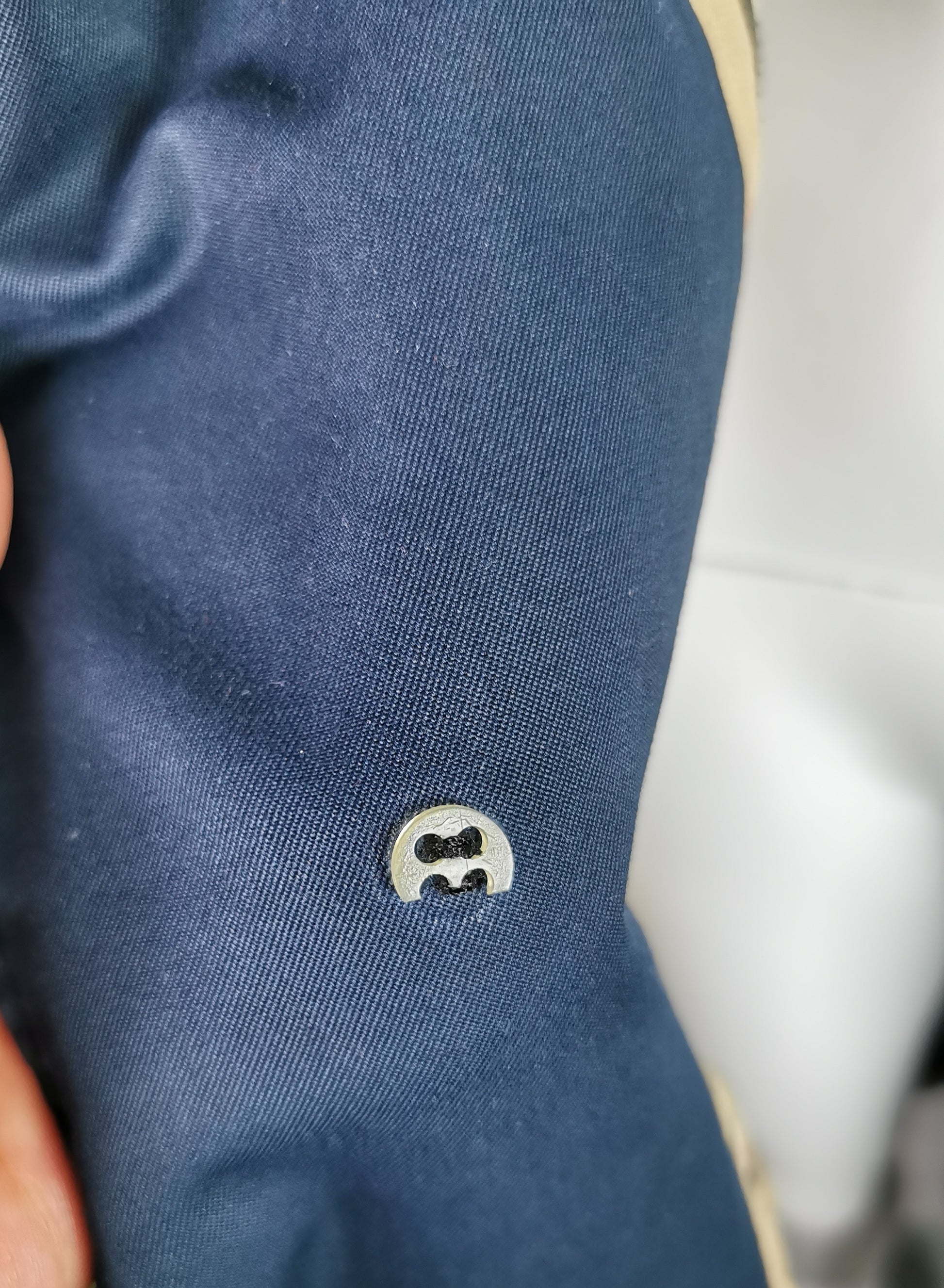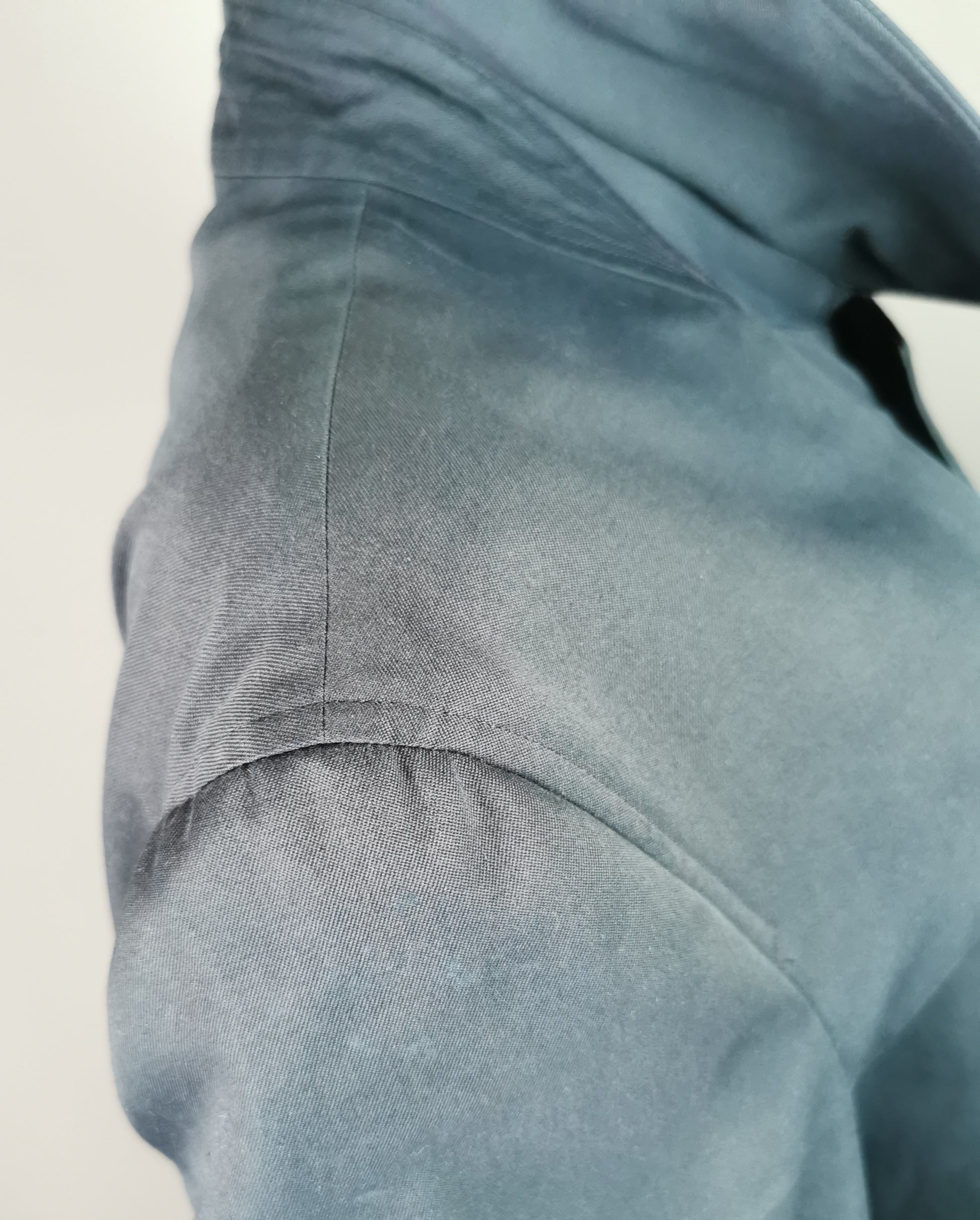 Fair used condition overall, signs of use and wear, some light scuff marks and light marks, some fade and wear to the collar and shoulders, missing one smaller inner button and one cracked.