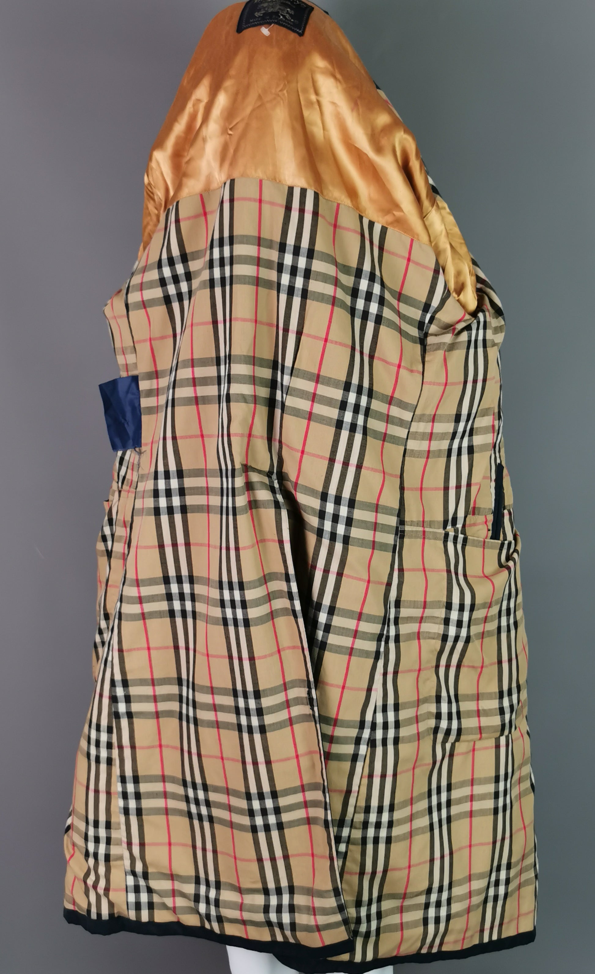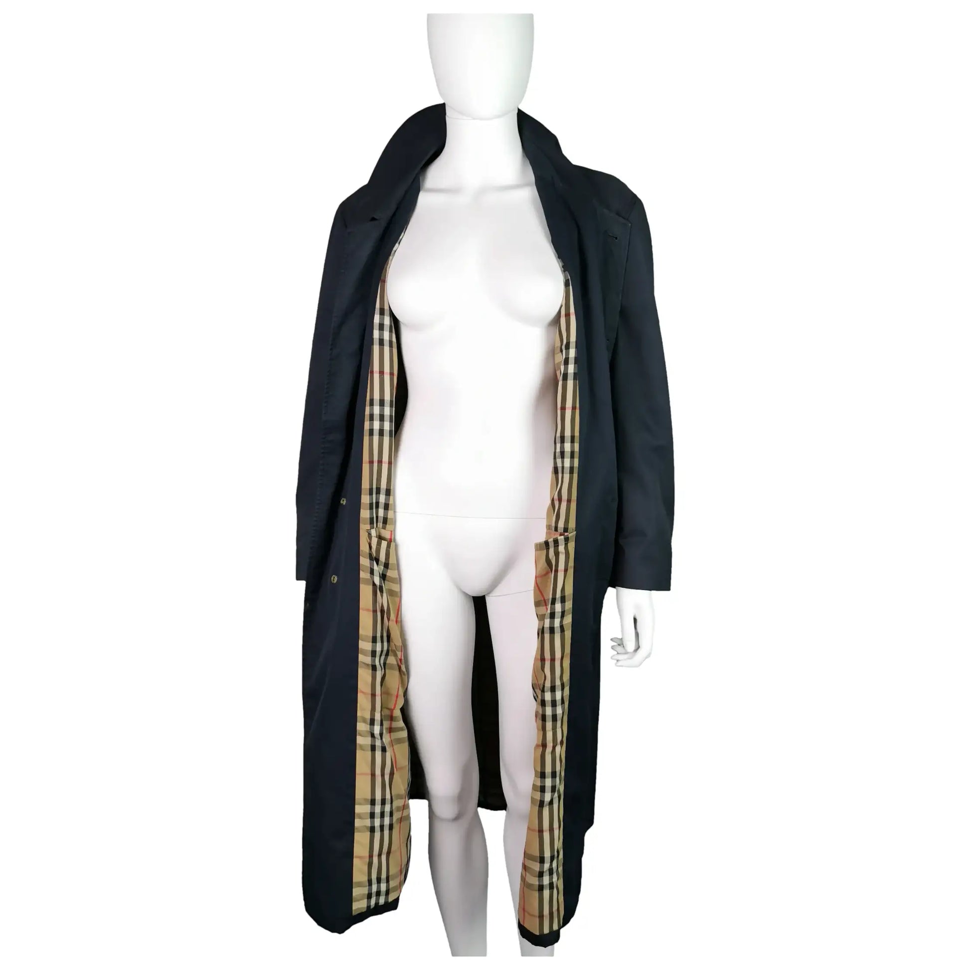 This is a beltless trench coat, navy blue with a classic Burberry Nova check lining.