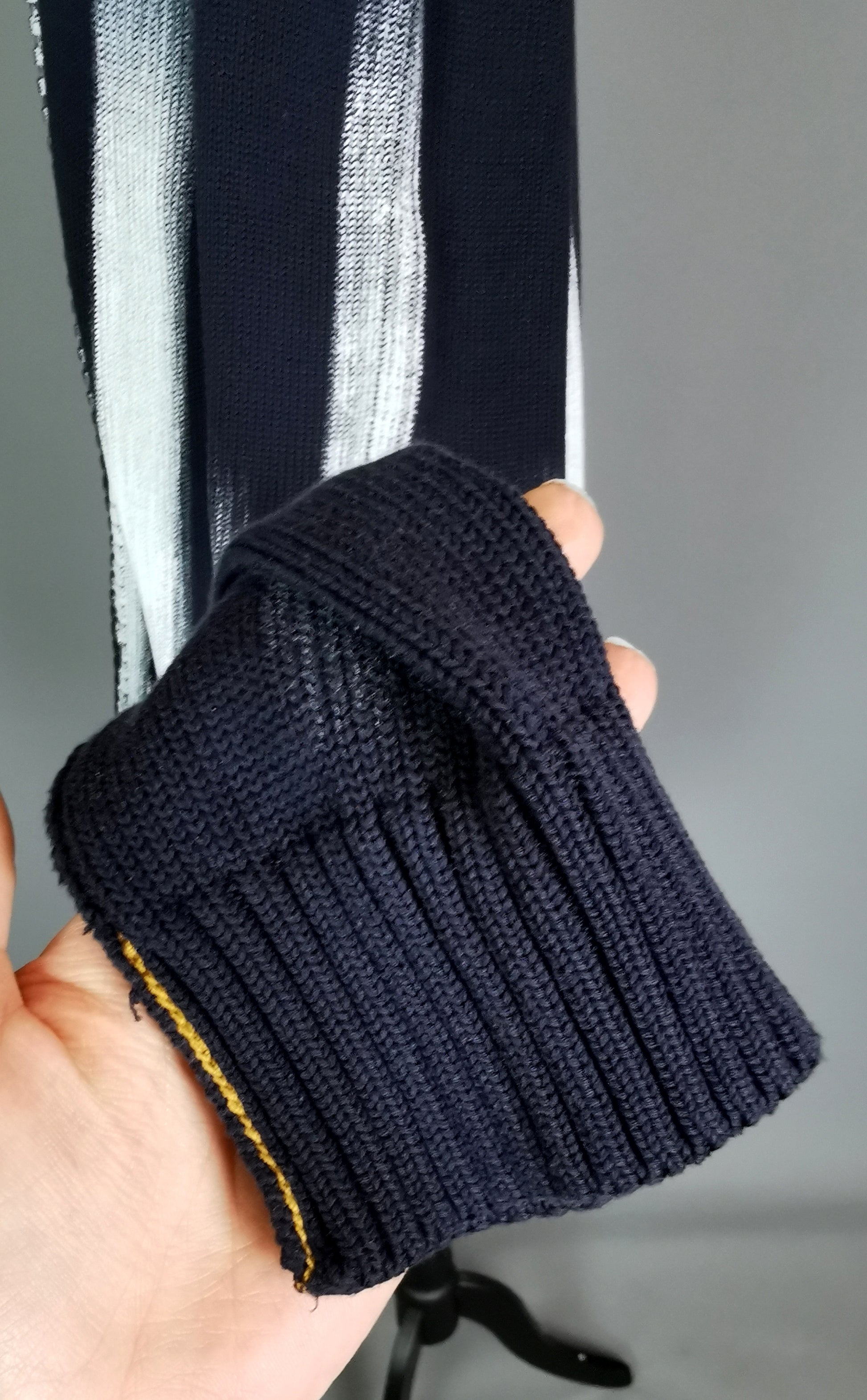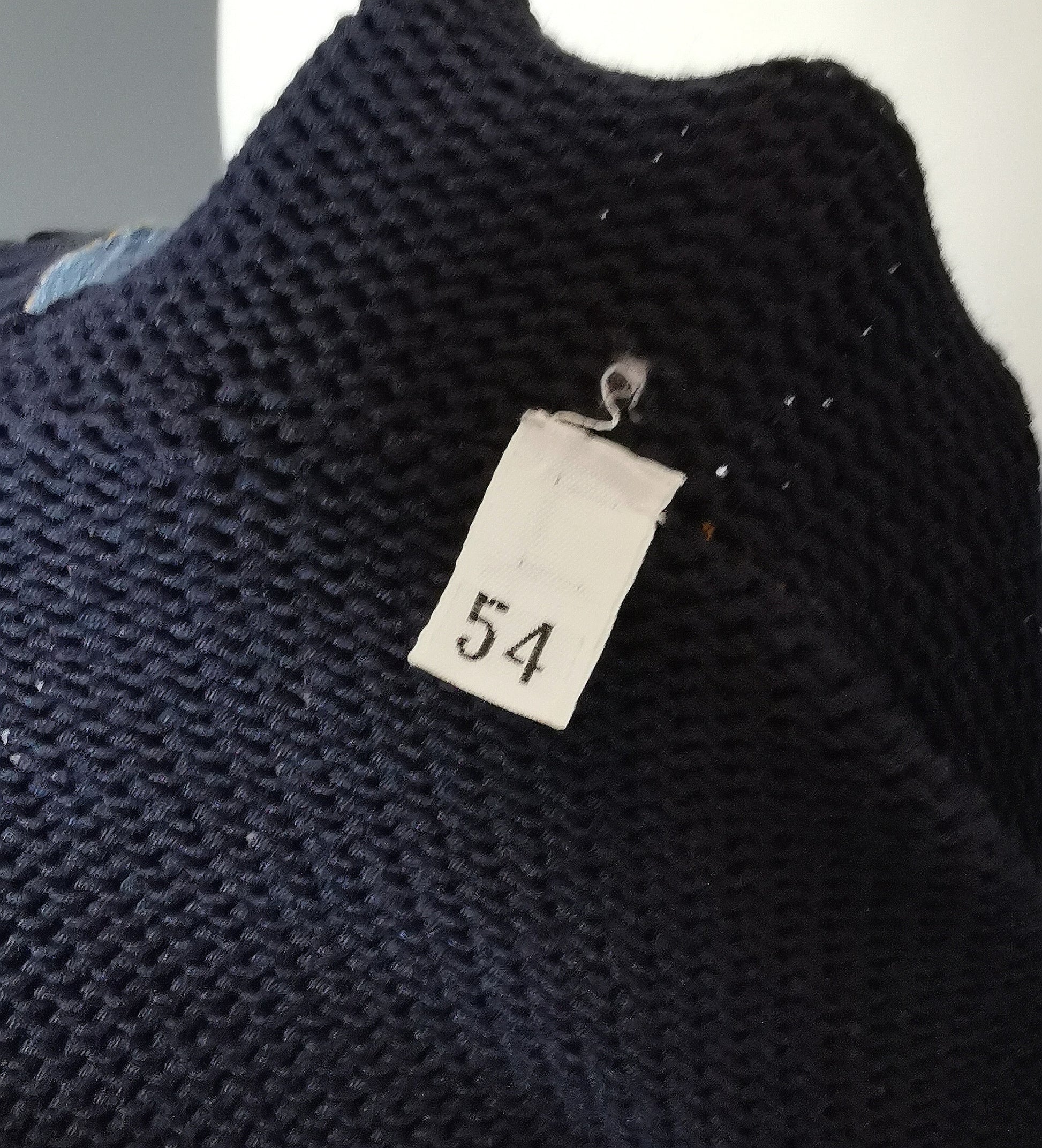 Dark navy blue wool mix in a chunky knit with a striking white 'paint' stripe design front and back.