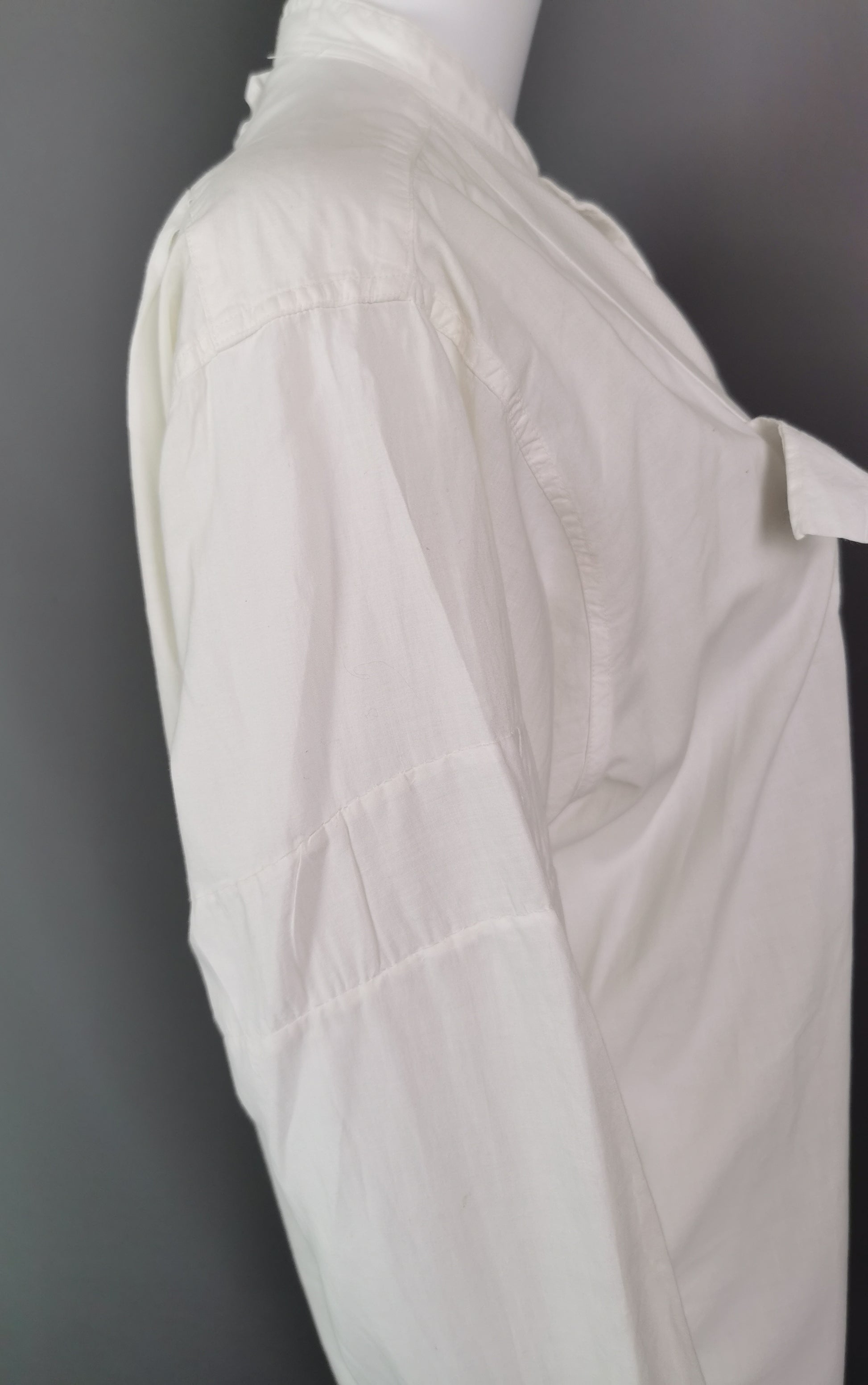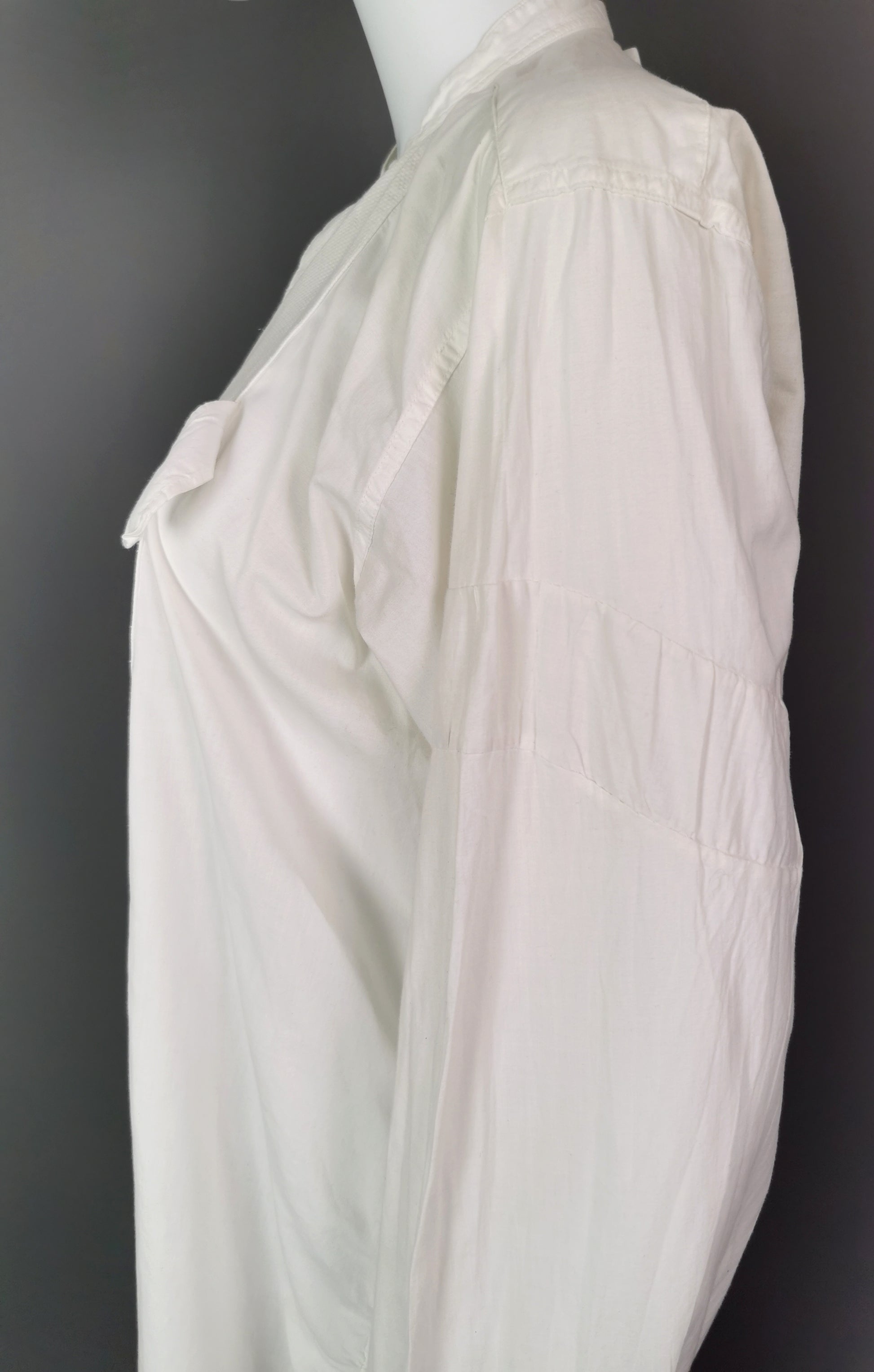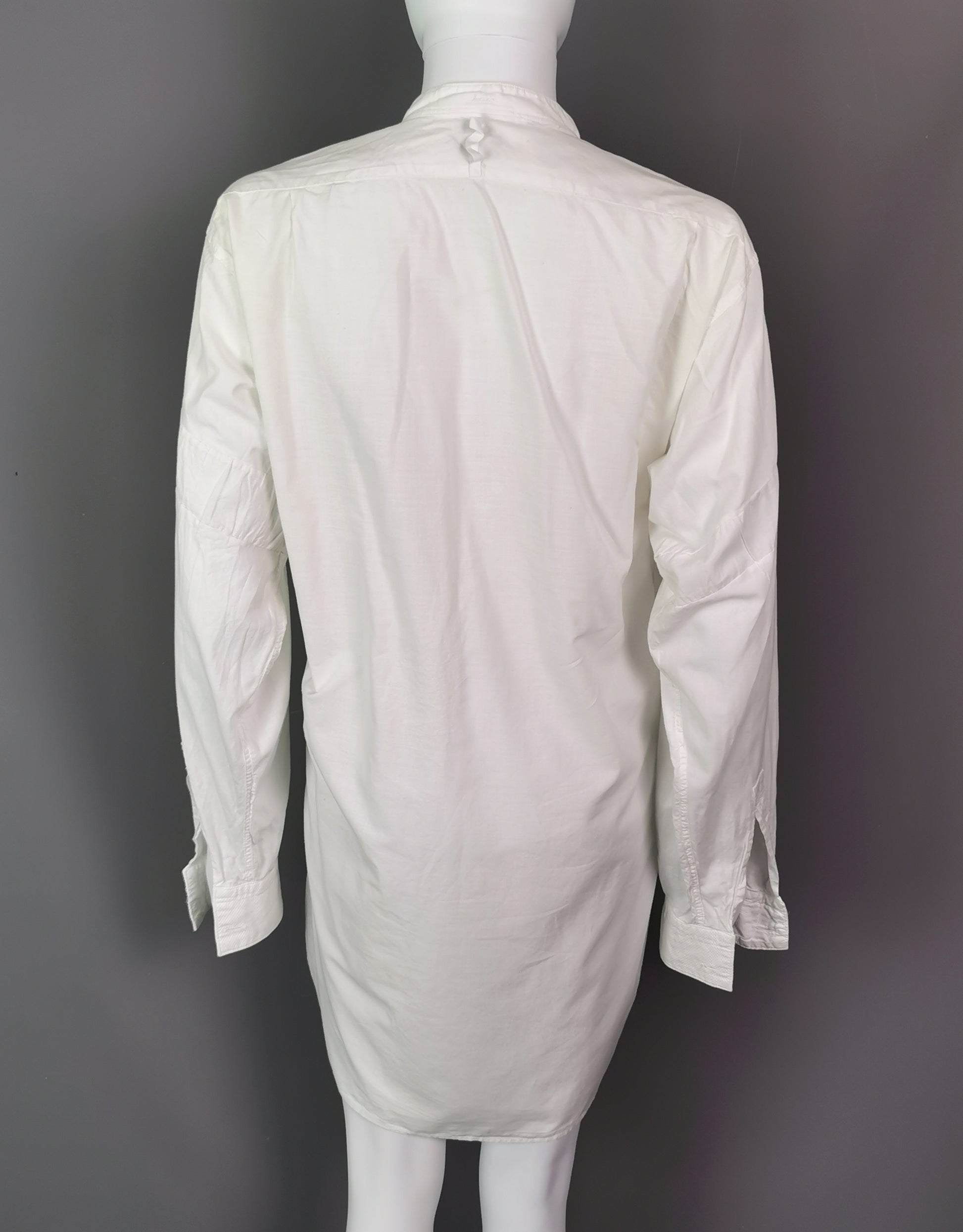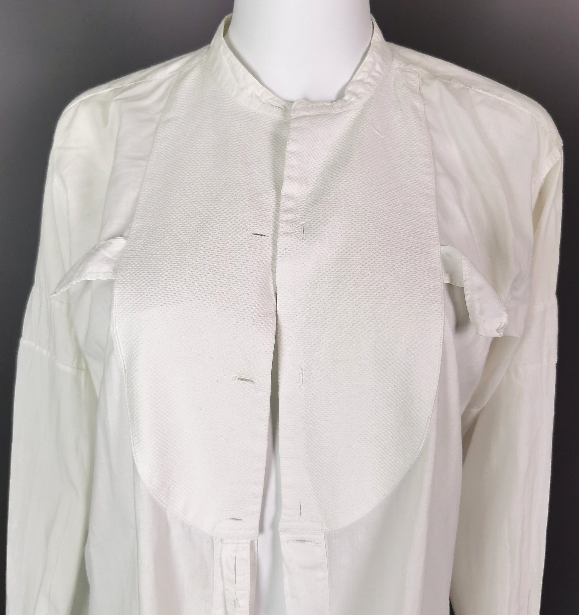 It is long sleeved, made from fine cotton, slightly longer at the back and has a waffle cloth bib front, it buttons down the front, designed to be worn with your own buttons.