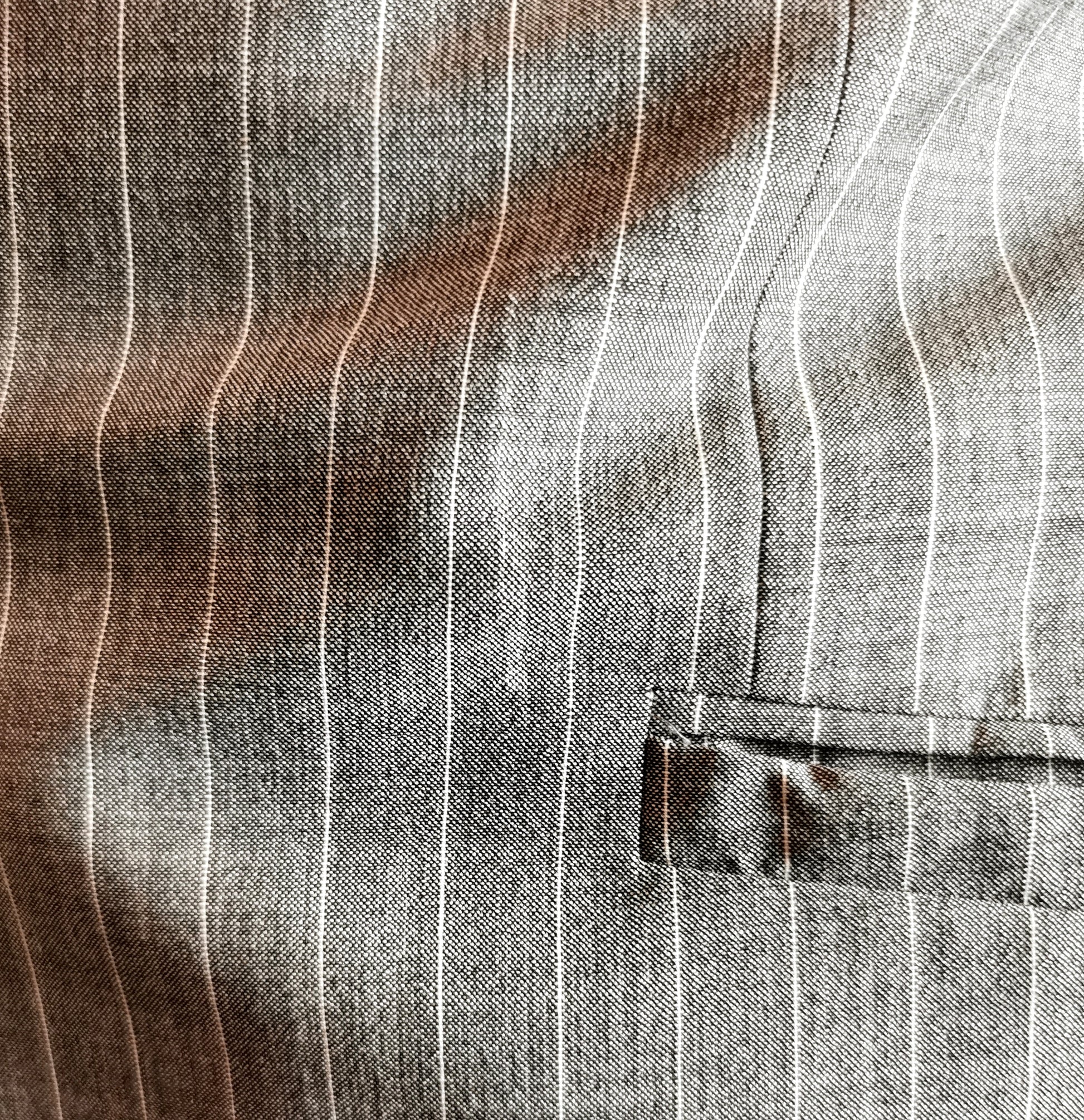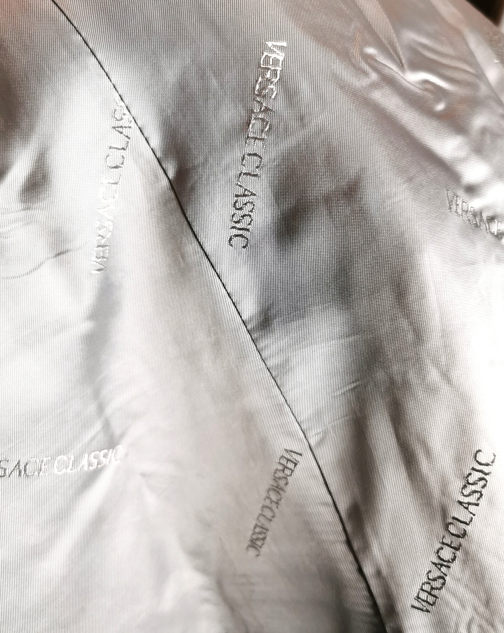 Trousers are unlined, the jacket is fully lined with branded silver lining button down front with grey plastic branded buttons.